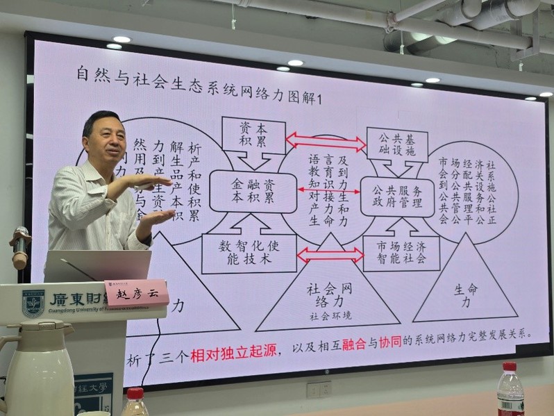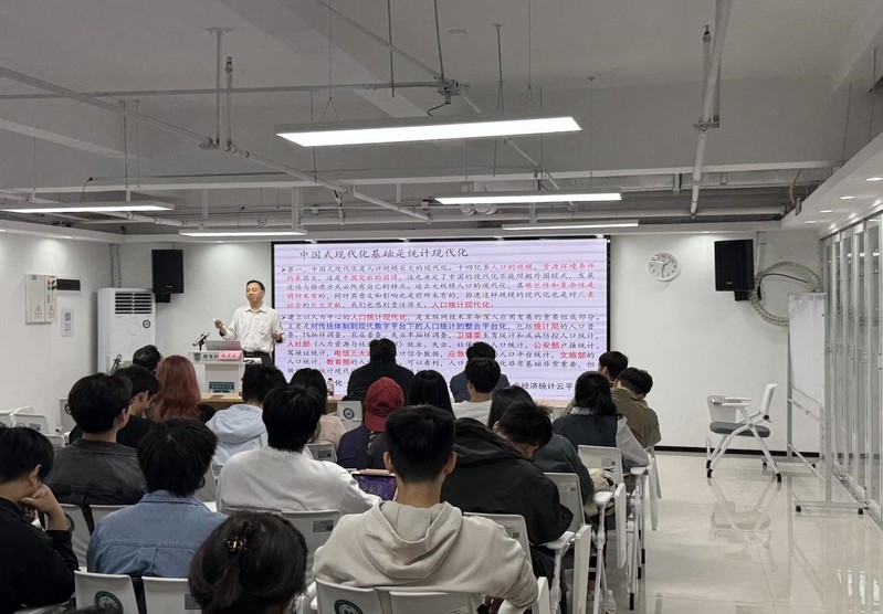 随后,赵彦云教授在揽月楼337,作题为《中国式现代化与数智科学统计学》的学术报告。报告从党的二十大提出的中国式现代化目标出发,系统阐释了人口规模、共同富裕、物质文明与精神文明协调发展、人与自然和谐共生以及和平发展道路等“五个维度”,强调中国式现代化的基础在于统计现代化,指出要以数智化使能技术重构人口统计、经济社会统计、生态文明统计和国防军队统计体系。在论述数智科学统计学的核心内容时,赵彦云教授重点提出“产品和服务统计现代化”是数智化社会运行的基础,主张以产品和服务最小统计颗粒为抓手,构建覆盖最大统计总体、贯通微观到宏观的系统网络统计框架,并通过自然力、生产力、知识力与社会网络力等要素的耦合,形成支持中国式现代化的新型生态系统网络统计逻辑。