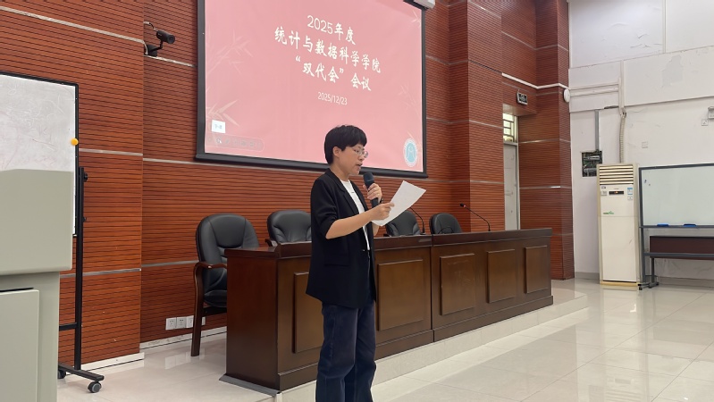 12月23日下午,统计与数据科学学院2025年度“双代会”在尚学楼110会议室隆重举行。会议于14时30分准时开始,学院全体教职工齐聚一堂,共同听取、审议学院年度各项工作报告,并选举产生2026年校级“双代会”代表。会议由学院党委副书记彭文霞主持。