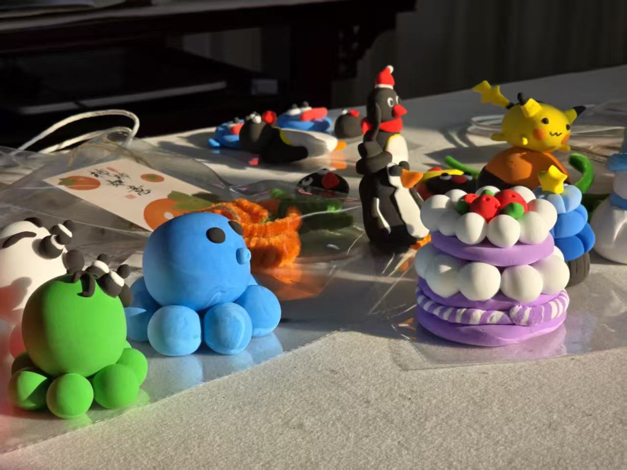 同学们制作的黏土作品精致可爱,皮卡丘、企鹅、蛋糕等造型栩栩如生,为活动增添了更多创意灵感,也展现了手工创作的多样可能性。