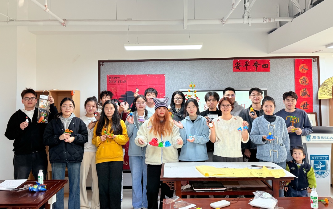元旦将至,新岁启封。为弘扬中华优秀传统文化,丰富学子精神文化生活,2026年1月3日,我院在广州校区揽月楼331美育工作室举办举办“扭出星愿·棒贺元春”研究生元旦手工活动,辅导员郭影玲老师共同参与,将传统节日与手工创作相融,同学们在指尖创意中编织新年美好祝福。