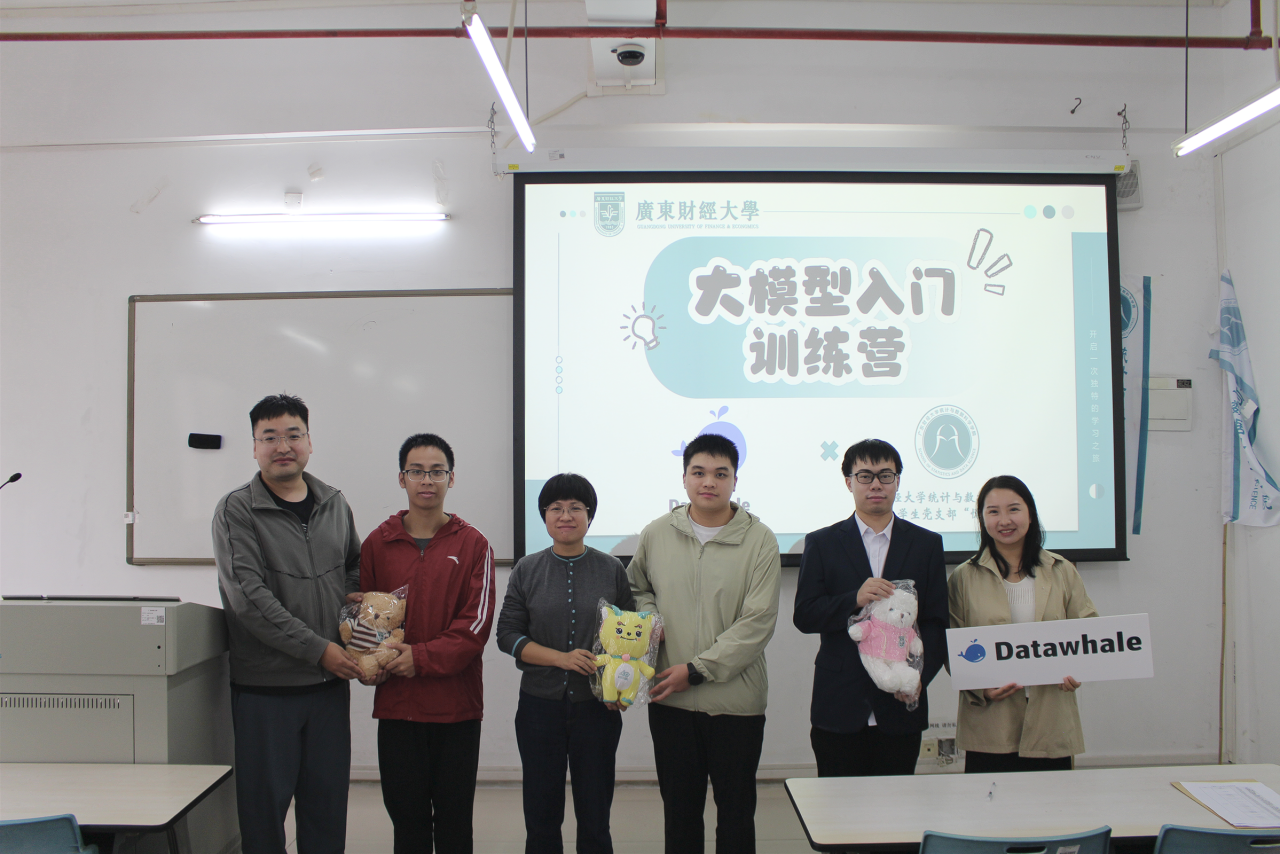 10月28日-11月4日,广东财经大学统计与数据科学学院联合Datawhale开源学习社区成功举办“大模型应用开发实训营”。此次实训营面向全校学生开放,吸引来自统计、数据科学与大数据技术、金融、计算机等不同专业的200名余同学踊跃报名,学院最后遴选100名同学参加实训营。实训营依托数学系学生党支部品牌活动“悦读行动”,由数学系学生党支部和数据科学系教工党支部联合组织实施。