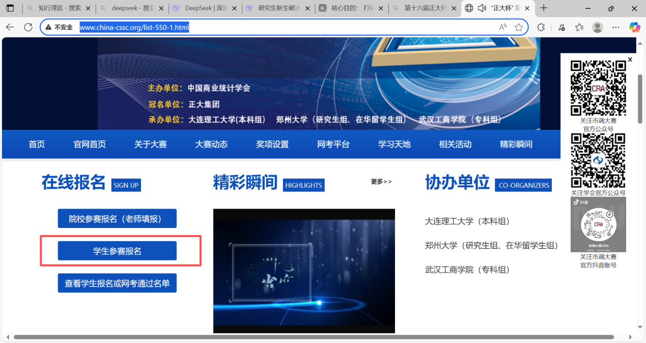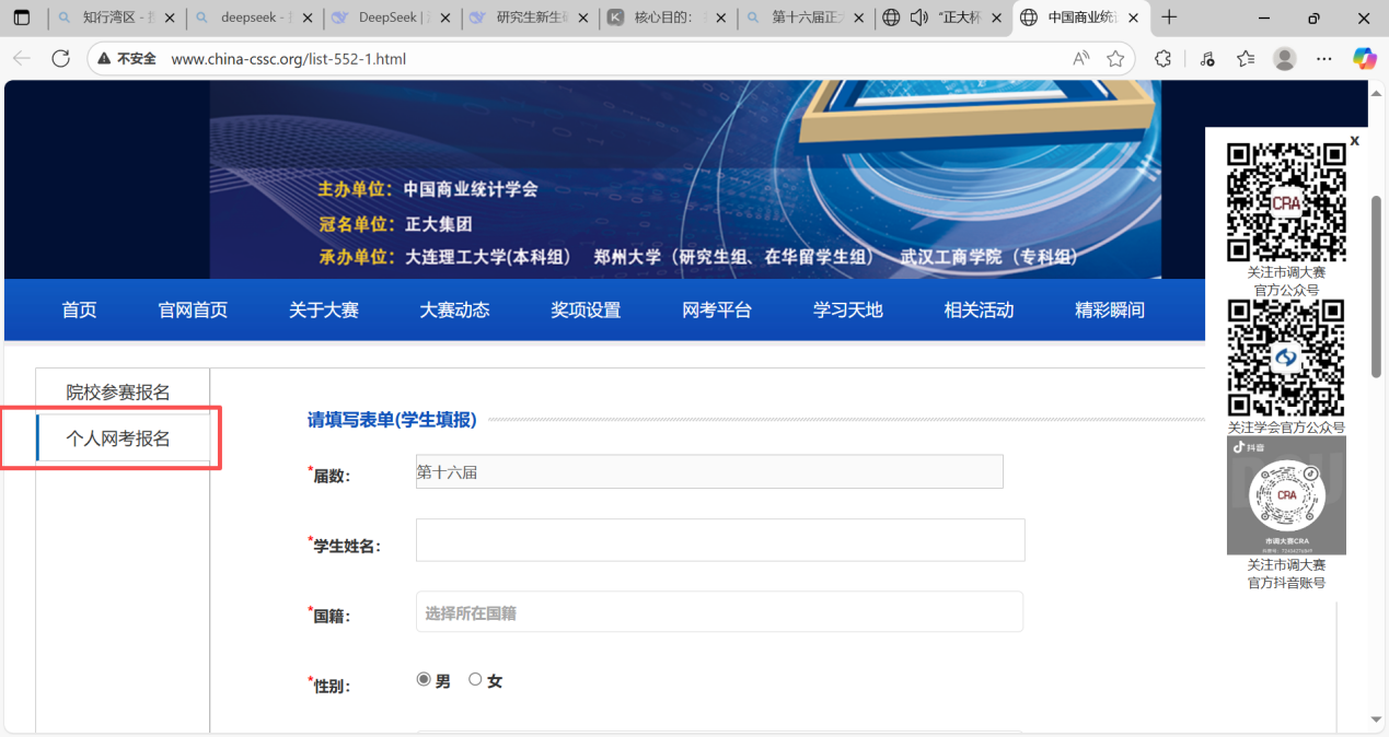 参赛学生访问“正大杯”第十六届全国大学生市场调查与分析大赛专题网页(http://www.china-cssc.org/list-550-1.html)点击“学生参赛报名“,按要求填写院校参赛代码及个人信息,填报细节见下文。
