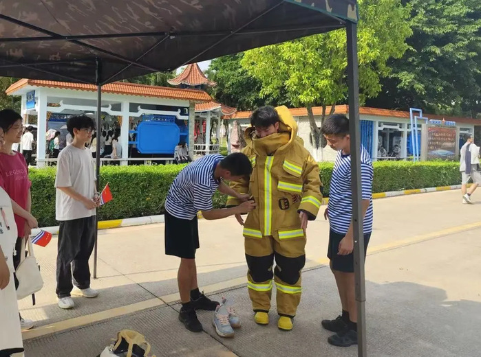 在互动体验环节中,吴振辉同学体验了约30斤重的灭火装具(衣服重10斤,氧气瓶重20斤),并顺利完成了灭火行动。专业人员还详细讲解了枪械的构造和使用方法,支部师生接触和操作了重达8斤的枪械,并且观摩了军体拳操演、旗语表演、刺杀操展示等内容。