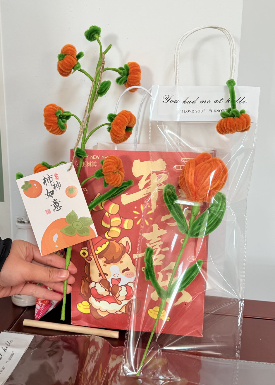 这份以扭扭棒制作的“柿柿如意”主题礼品,搭配新年祝福卡片与精美包装,橙绿相间的柿子造型鲜活灵动,承载着“事事如意”的美好新年寓意。